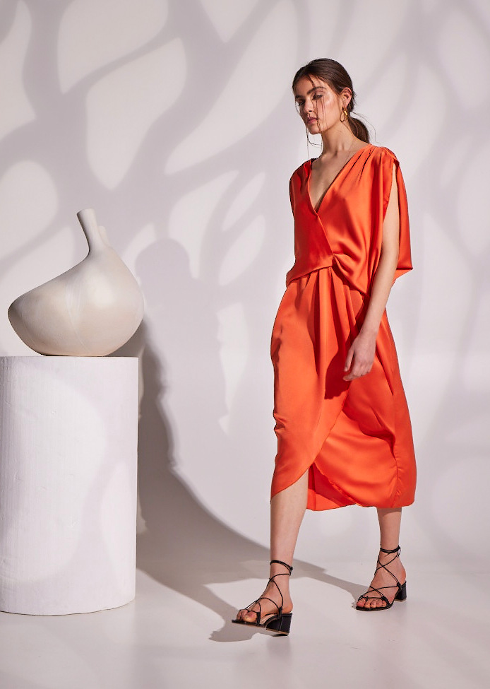 Pearl midi wrap dress in burnt orange is essential for Spring and Summer. Its ethereal feel and silky fabric makes it perfect to wear it for a special occasion. Wraps in the upper part for a perfect bustier and also on the lower part for a flattering leg split. The loose fit and comfy feel are ideal for every body type. Wear the wrap dress with flat sandals or high heels.
